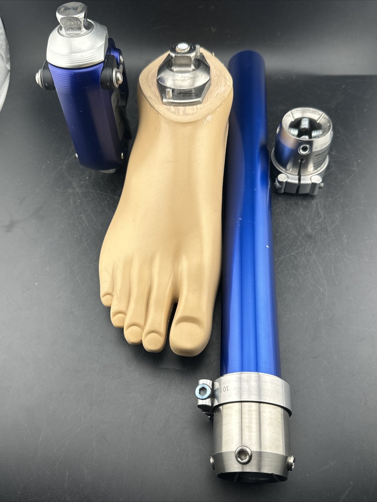 Plie3 water-proof prosthetic knee and reflex foot. This is a working plie3 waterproof knee with a tortion joint and a size 10.5 reflex foot. The knee comes with a home charger, a car charger and 2 batteries so you can always have one charging. Use the included air pump to adjust joint stiffness for running, playing sports, or exercising. All components are in great working condition. See photos. This is a pre-owned item that contains scuffs and scratches from normal use that do not affect functionality in any way. This is a great deal that won't last long. Message me with any questions.